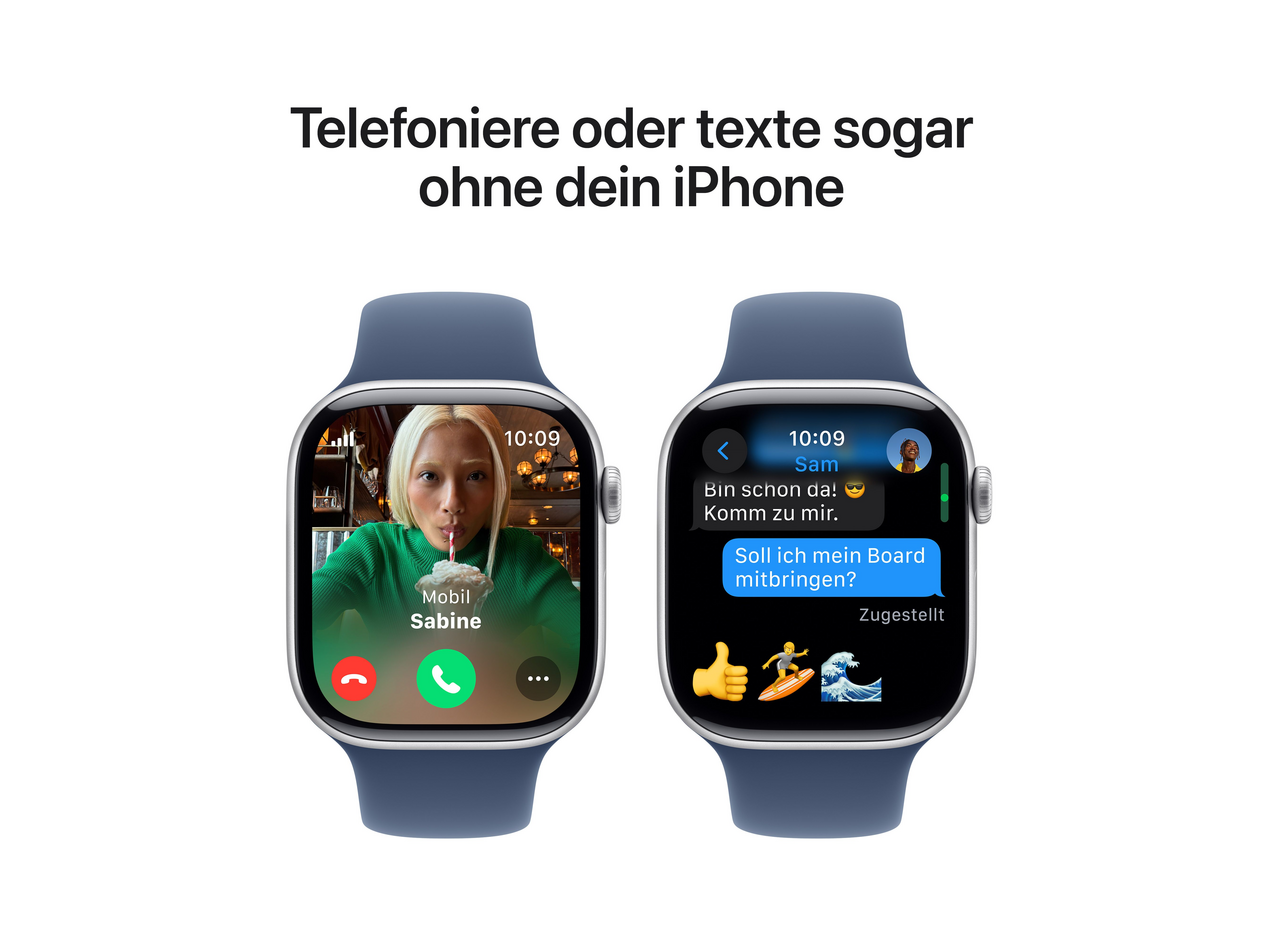 LEIB IN VERBINDUNG – Sende unterwegs eine Textnachricht, nimm einen Anruf an, hör Musik und Podcasts, verwende Siri und erhalte Mitteilungen. Die Apple Watch Series 10 (GPS) funktioniert mit deinem iPhone und im WLAN, damit du in Verbindung bleibst.
