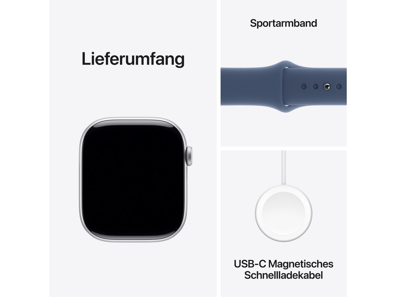 Lieferumfang: Aluminiumgehäuse silber, Sportarmband (S/M), Apple Watch magnetisches Schnellladegerät auf USB-C Kabel (1m)