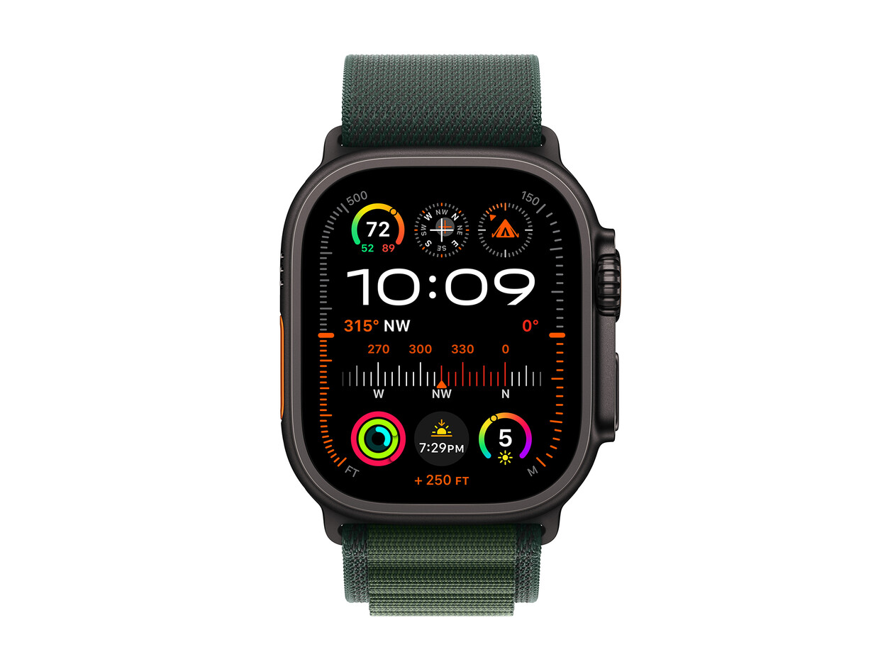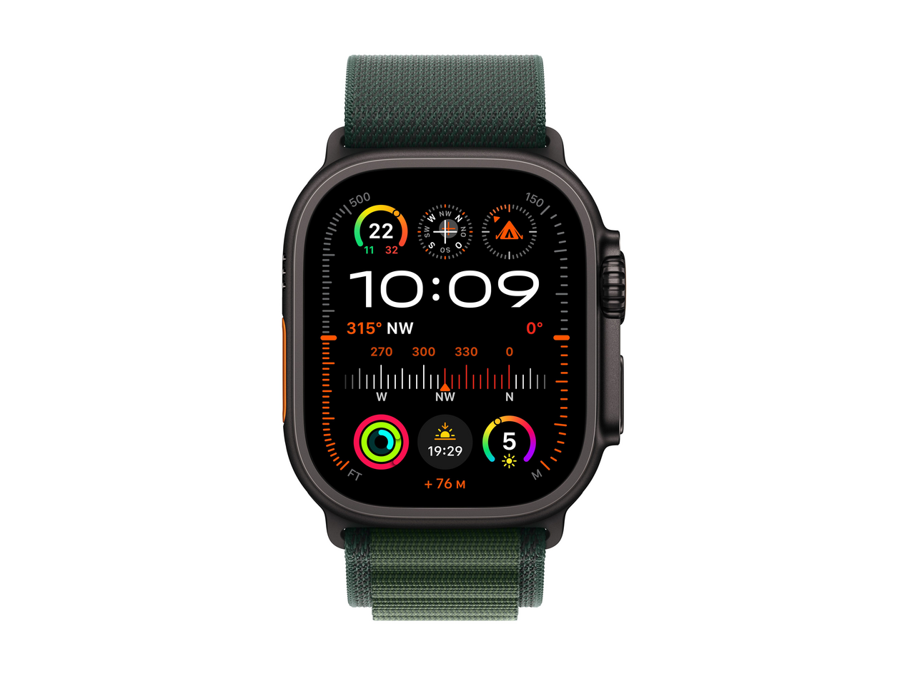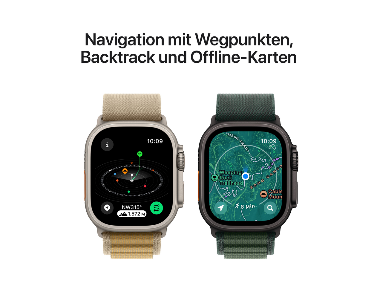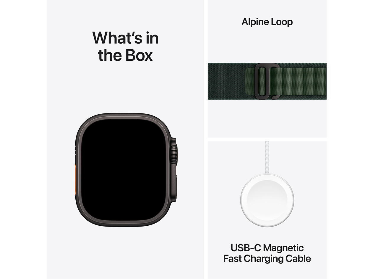 Lieferumfang: Titangehäuse schwarz, Alpin-Armband (large), Apple Watch magnetisches Schnellladegerät auf USB-C Kabel (1m)