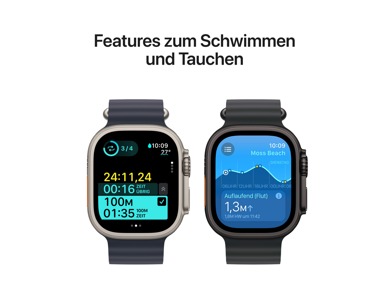 WARUM APPLE WATCH ULTRA 2 – Die ultimative Uhr für Sport und Abenteuer. Fortschrittliche Features fürs Laufen, Radfahren, Schwimmen, Wandern, Tauchen und mehr. Robustes Titangehäuse, jetzt in satiniertem Schwarz erhältlich. Superhelles Always On Retina Display. Unglaublich präzises Dual-Frequenz GPS. Leistungsstarke Features für Gesundheit, Sicherheit und Konnektivität. Und bis zu 36 Stunden Batterielaufzeit bei normaler Nutzung und im Stromsparmodus bis zu 72 Stunden.