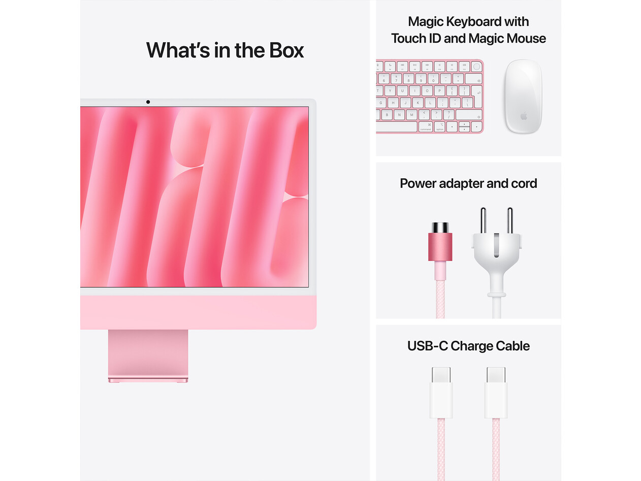 Im Lieferumfang: 24" iMac, Magic Keyboard, Magic Mouse, 143W Power Adapter (Netzteil), Netzkabel (2 m), USB-C Ladekabel