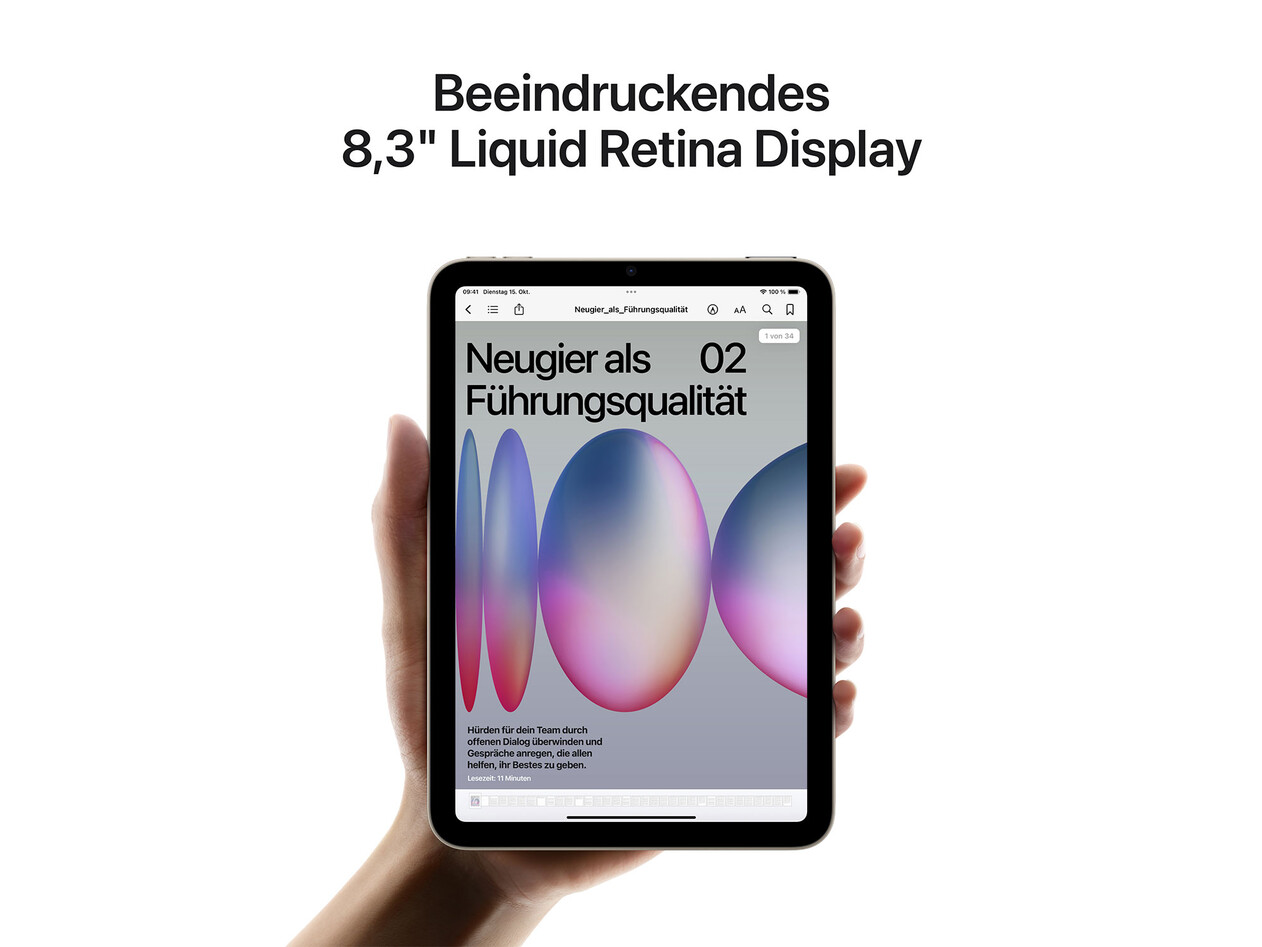 8,3" MultiTouch Display (21,08 cm Diagonale) mit LED-Hintergrund-Beleuchtung und IPS Technologie, 2266 x 1488 Auflösung bei 326 ppi, Display mit großem Farbraum (P3), True Tone Display, Fettabweisende Beschichtung, vollständig laminiertes Display, Antireflex-Beschichtung, 500 Nits Helligkeit, Unterstützt den Apple Pencil (2. Generation), A17 Pro Chip mi 6-Core CPU mit 2 Performance-Kernen un 4 Effizienz-Kernen, 5-Core Grafik, 16-Core Neural Engine, Kapazität: 512 GB, 12 MP Weitwinkel-Kamera, Bis zu 5x digitaler Zoom, Objektiv mit 5 Elementen, True Tone Blitz, 4K Videoaufnahme mit 24 fps, 25 fps, 30 fps oder 60 fps, 1080p HD Videoaufnahme mit 25 fps, 30 fps oder 60 fps, 720p HD Videoaufnahme mit 30 fps, 12 MP Ultraweitwinkel-Frontkamera, FaceTime Video- und Audioanrufe, Folgemodus, WLAN 802.11ax WLAN 6E mit 2x2 MIMO, simultanes Dualband, Bluetooth 5.3, 5G mit 4x4 MIMO (Frequenzbänder n1, n2, n3, n5, n7, n8, n12, n20, n25, n28, n29, n30, n38, n40, n41, n48, n66, n71, n77, n78, n79, FDDLTE (Frequenzbänder 1, 2, 3, 4, 5, 7, 8, 11, 12, 13, 14, 17, 18, 19, 20, 21, 25, 26, 28, 29, 30, 32, 66, 71), TDLTE (Frequenzbänder 34, 38, 39, 40, 41, 42, 46, 48), UMTS/HSPA/HSPA+/DCHSDPA (850, 900, 1700/2100, 1900, 2100 MHz), eSIM, Digitaler Kompass, iBeacon Mikro-Ortung, GPS/GNSS, Touch ID, 3-Achsen Gyrosensor, Beschleunigungssensor, Barometer, Umgebungslichtsensor, USB-C Anschluss, Integrierte wiederaufladbare Lithium-Polymer-Batterie mit 19,3 Wattstunden