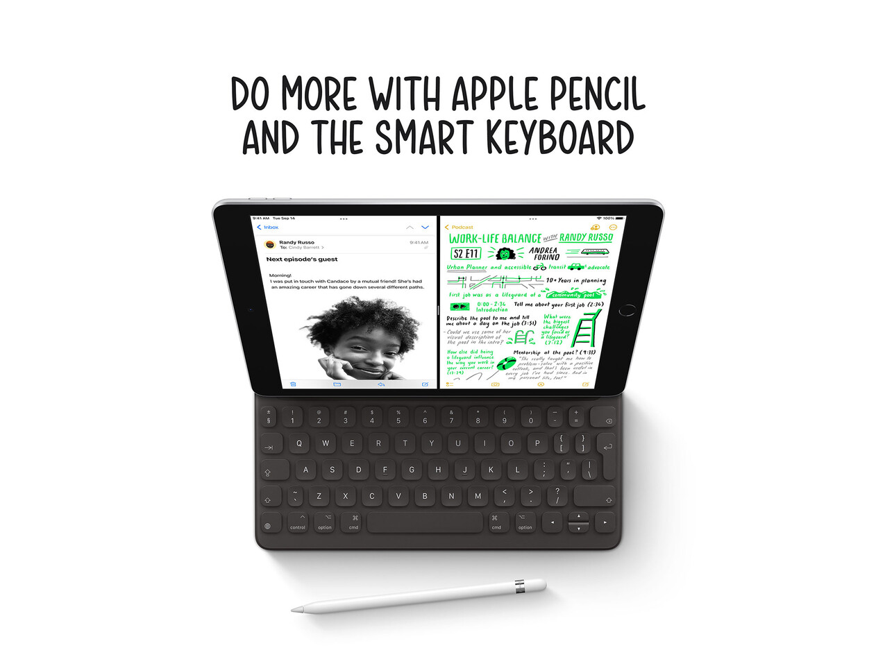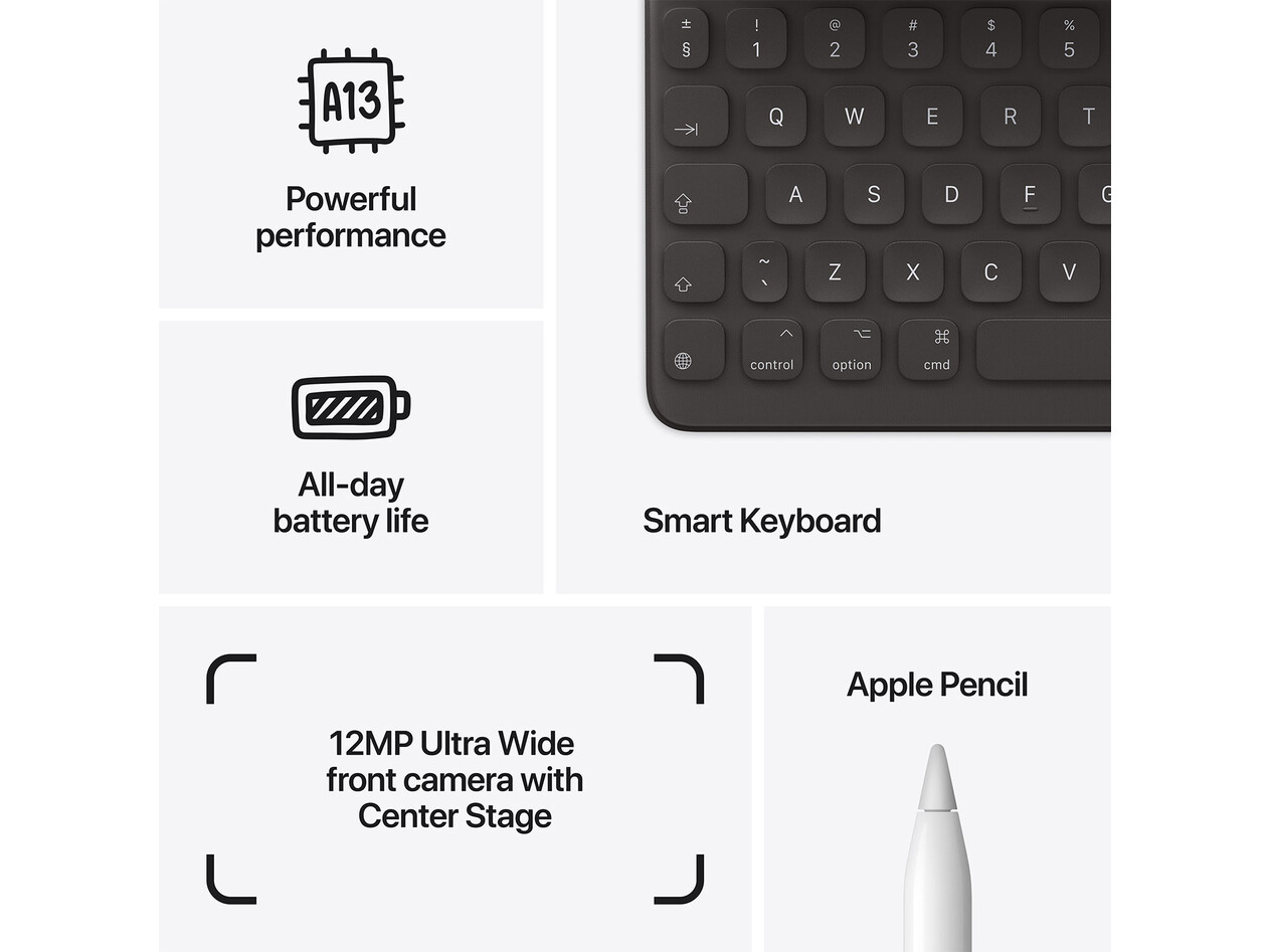 10,2" Multi-Touch Display (25,91 cm Diagonale) mit LED-Hintergrund-Beleuchtung und IPS Technologie, 2160 x 1620 Auflösung bei 264 ppi, True Tone Display, 500Nits Helligkeit, Fettabweisende Beschichtung, Unterstützt den ApplePencil (1. Generation), A13 Bionic Chip mit 64Bit Architektur, Neural Engine, Kapazität: 256 GB, 8 MP Weitwinkel-Kamera, Bis zu 5x digitaler Zoom, Objektiv mit 5 Elementen, Panoramabild (bis zu 43 MP), HDR für Fotos, Geotagging für Fotos, Automatische Bildstabilisierung, Serienbildmodus, 1080p HD Videoaufnahme mit 25 fps und 30 fps, 720p HD Videoaufnahme mit 30 fps, 3x Videozoom, Unterstützung für Zeitlupenvideo in 720p mit 120 fps, Zeitraffervideo mit Bildstabilisierung, 12 MP Ultraweitwinkel-Kamera, 122° Sichtfeld, Stereo-Lautsprecher, Zwei Mikrofone für Anrufe, Video- und Audioaufnahmen, WLAN (802.11a/b/g/n/ac), Dualband (2,4 GHz und 5 GHz), HT80 mit MIMO, Bluetooth 4.2, Digitaler Kompass, Wi-Fi, iBeacon Mikro-Ortung, Sensoren: Touch ID, 3-Achsen Gyrosensor, Beschleunigungssensor, Barometer, Umgebungslichtsensor, Integrierte wiederaufladbare Lithium-Polymer-Batterie mit 32,4 Wattstunden