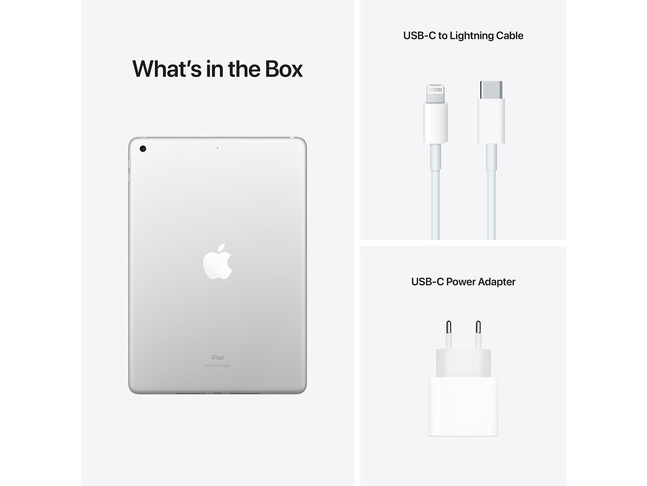 Im Lieferumfang: 1x iPad 10.2“, 1x Lightning auf USBC Kabel, 1x 20W USBC Power Adapter