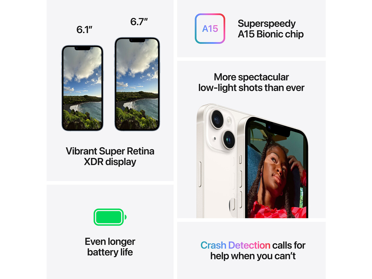 iPhone 14. 6,1"Super Retina XDR OLED Display* für strahlend helles Weiß und tiefes Schwarz mit lebensechten Farben und gestochen scharfen Details.