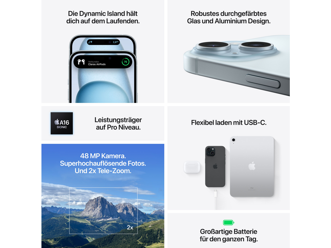 iPhone 15 Plus. Hol dir das große Upgrade. Das iPhone 15 Plus mit der Dynamic Island, einer 48 MP Hauptkamera und USB C – alles in einem robusten Design aus durchgefärbtem Glas und Aluminium.