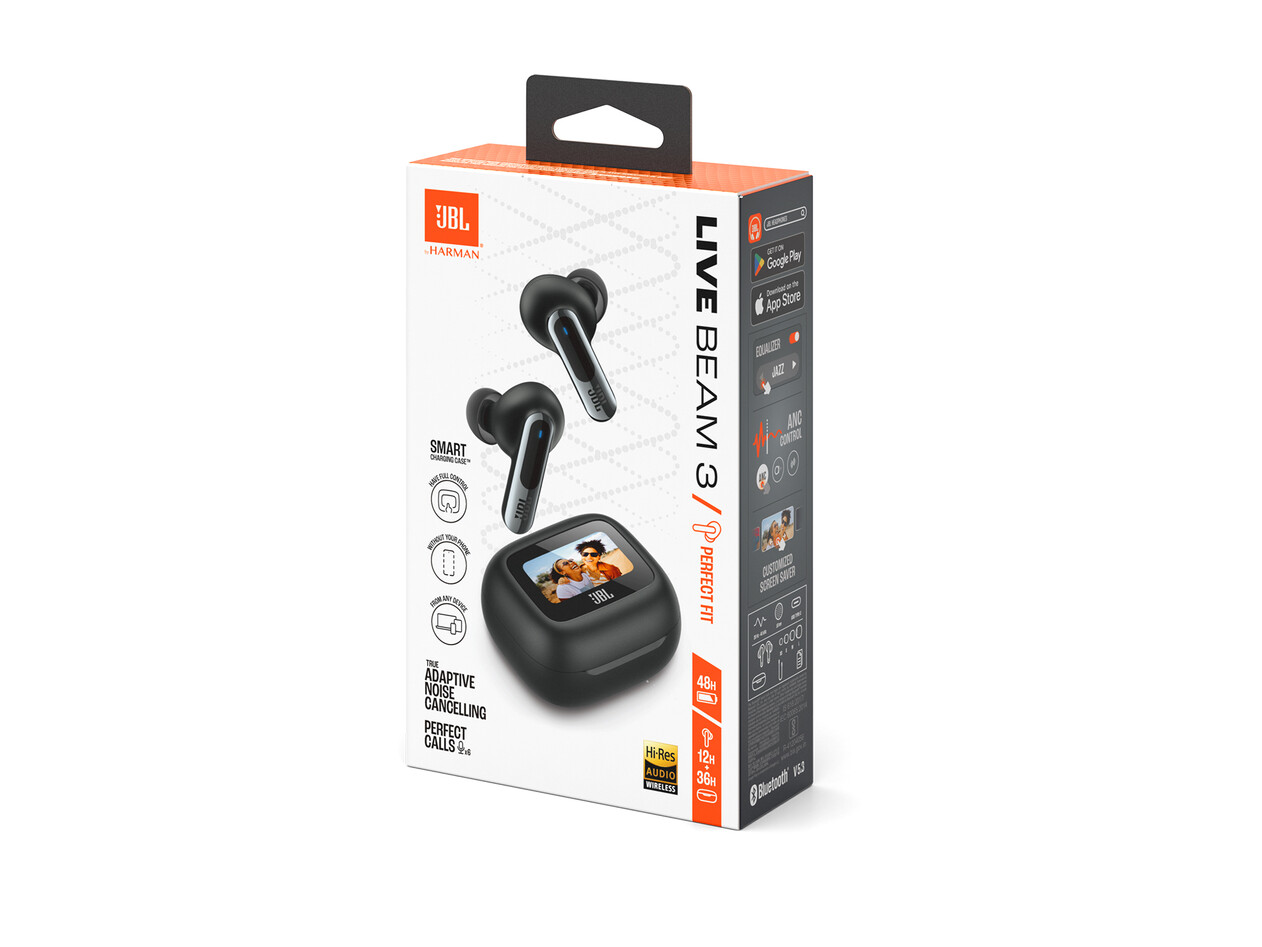 Funktionen individuell anzupassen, ohne die JBL-App auf deinem Gerät zu öffnen. Passe Lautstärke und EQ an, steuere deine Musik, nimm Telefonanrufe entgegen, siehe Nachrichten an. Sogar den Bildschirmschoner kannst du mit deinen Lieblingsfotos individuell einstellen. Und das alles, bevor du überhaupt den monumentalen JBL Signature Sound der Live Beam 3 Ohrhörer selbst genießt. Erstklassiges True Adaptive Noise Cancelling blendet Ablenkungen aus. JBL Spatial Sound lässt Filme und Musik einfach beeindruckender werden. Und wenn du einen Anruf entgegennehmen musst, sorgen sechs Mikrofone auch in der lautesten Umgebung für perfekte Soundqualität. Das alles plus 48 Stunden Akku: 12 Stunden in den Ohrhörern* und weitere 36 in der Ladebox - zudem können sie kabellos aufgeladen werden. Die Ladebox verfügt über eine Schlaufe zum Befestigen eines Bandes für noch mehr Komfort. Großartiger Sound war noch nie so einfach. (*mit ausgeschaltetem ANC)