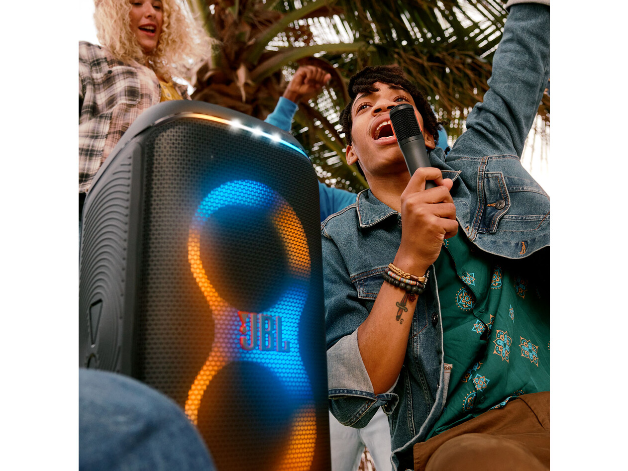 klappbaren ergonomischen Griffs kann die PartyBox Club 120 mühelos überallhin mitgenommen werden und durch die spritzwasserfeste Konstruktion macht ihr auch leichter Regen nichts aus. Sie bietet eine Wiedergabezeit von bis zu 12 Stunden, und wenn die Party länger dauert, ersetzt du einfach den austauschbaren Akku und schon gehen Musik und Lichtshow weiter. Für noch mehr Spaß kombinierst du zwei JBL PartyBox Club 120 für ein breiteres Klangbild oder verbindest mehrere Auracast-fähige JBL-Lautsprecher kabellos über die JBL PartyBox App. Mit der JBL PartyBox Club 120 kann die Party steigen.