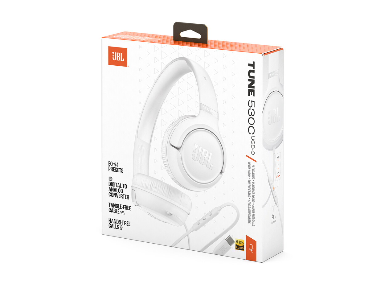 Lerne den Kopfhörer JBL Tune 530C USB-C kennen – deine tägliche Quelle für kräftigen Sound und ausdrucksstarken Stil. Hi-Res-Audio und JBL Pure Bass Sound verleihen jeder Playlist, jedem Podcast oder jedem Anruf lebendige Klarheit. Die weichen Ohrpolster und der gepolsterte Kopfbügel sorgen den ganzen Tag über für Tragekomfort, während die frische Farbauswahl und die legendären Designdetails eine persönliche Note ins Spiel bringen. Steuere deine Musik und nimm Anrufe entgegen, ohne einen Ton zu verpassen – ermöglicht durch eine Universal-Fernbedienung mit 3 Tasten und integriertem Mikrofon. Das flache USB-C-Kabel bleibt verwicklungsfrei und ist mit mehreren Geräten kompatibel. Dank seines faltbaren Designs kannst du den Kopfhörer mühelos überallhin mitnehmen – zur Arbeit, ins Fitnessstudio oder einfach nur auf die Couch. Setz dir deinen JBL Tune 530C USB-C auf und verwandle deinen Alltag in etwas Außergewöhnliches.