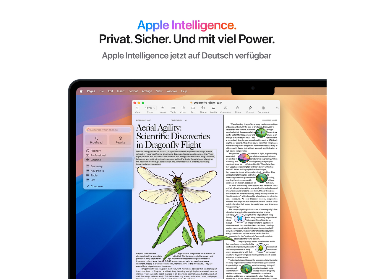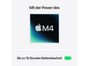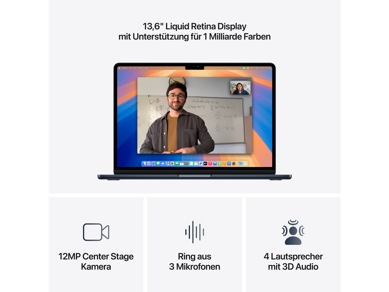 13,6 Liquid Retina Display (38,91 cm Diagonale), 2880 x 1864 native Auflösung bei 224 ppi; 500 Nits Helligkeit; 1 Milliarde Farben, Großer Farbraum (P3), True Tone Technologie; Apple M4 Chip; 10-Core CPU mit 4 Performance-Kernen und 6 Effizienz-Kernen, 10-Core GPU, Hardware beschleunigtes Raytracing, 16-Core Neural Engine, 120GB/s Speicherbandbreite; Hardware-beschleunigtes H.264, HEVC, ProRes und ProRes RAW; Bis zu 18 Std. Video-Streaming, Bis zu 15 Std. drahtloses Surfen, Lithium-Polymer-Batterie mit 66,5 Wattstunden; 3,5 mm Kopfhöreranschluss, MagSafe 3 Ladeanschluss; zwei Thunderbolt 4 (USB-C) Anschlüsse mit Unterstützung für: Aufladen, DisplayPort, Thunderbolt 4 (bis zu 40 Gbit/s), USB 4; Beleuchtetes Magic Keyboard; WLAN 6E (802.11ax), Bluetooth 5.3; 1080p HD Videoaufnahme, 12MP Center Stage Kamera; 6-Lautsprecher-Soundsystem mit Tieftönern mit Kräfteausgleich