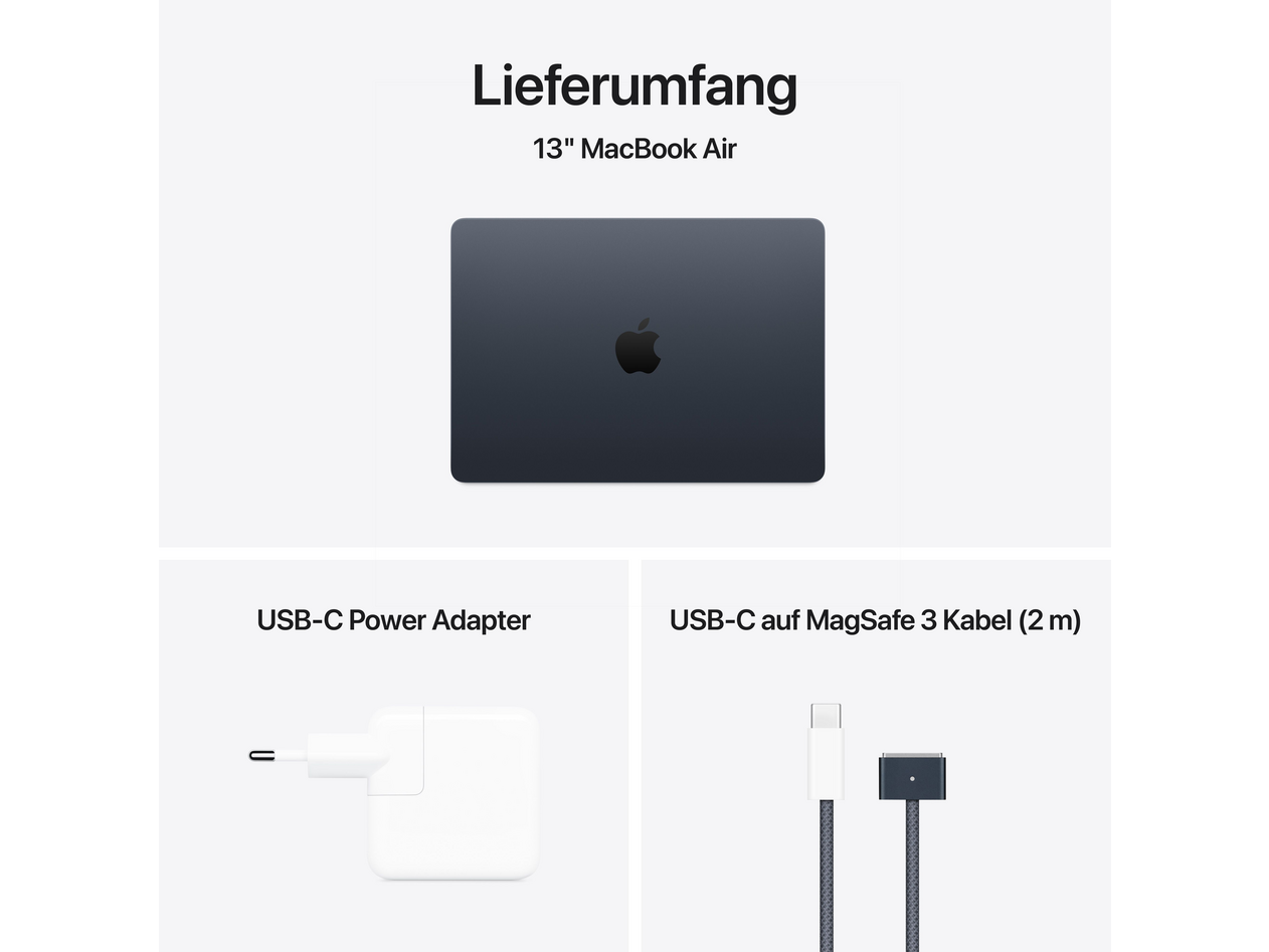 Im Lieferumfang: 13,6 Zoll MacBook Air, 30W Dual USB-C Power Adapter, USB-C auf MagSafe 3 Kabel (2 m)