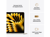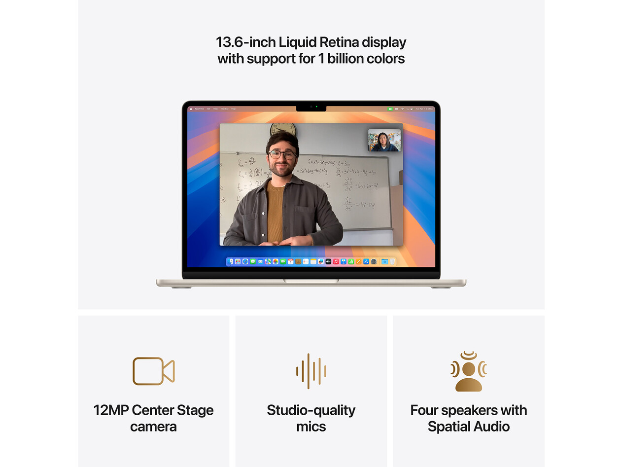13,6 Liquid Retina Display (38,91 cm Diagonale), 2880 x 1864 native Auflösung bei 224 ppi; 500 Nits Helligkeit; 1 Milliarde Farben, Großer Farbraum (P3), True Tone Technologie; Apple M4 Chip; 10-Core CPU mit 4 Performance-Kernen und 6 Effizienz-Kernen, 10-Core GPU, Hardware beschleunigtes Raytracing, 16-Core Neural Engine, 120GB/s Speicherbandbreite; Hardware-beschleunigtes H.264, HEVC, ProRes und ProRes RAW; Bis zu 18 Std. Video-Streaming, Bis zu 15 Std. drahtloses Surfen, Lithium-Polymer-Batterie mit 66,5 Wattstunden; 3,5 mm Kopfhöreranschluss, MagSafe 3 Ladeanschluss; zwei Thunderbolt 4 (USB-C) Anschlüsse mit Unterstützung für: Aufladen, DisplayPort, Thunderbolt 4 (bis zu 40 Gbit/s), USB 4; Beleuchtetes Magic Keyboard; WLAN 6E (802.11ax), Bluetooth 5.3; 1080p HD Videoaufnahme, 12MP Center Stage Kamera; 6-Lautsprecher-Soundsystem mit Tieftönern mit Kräfteausgleich
