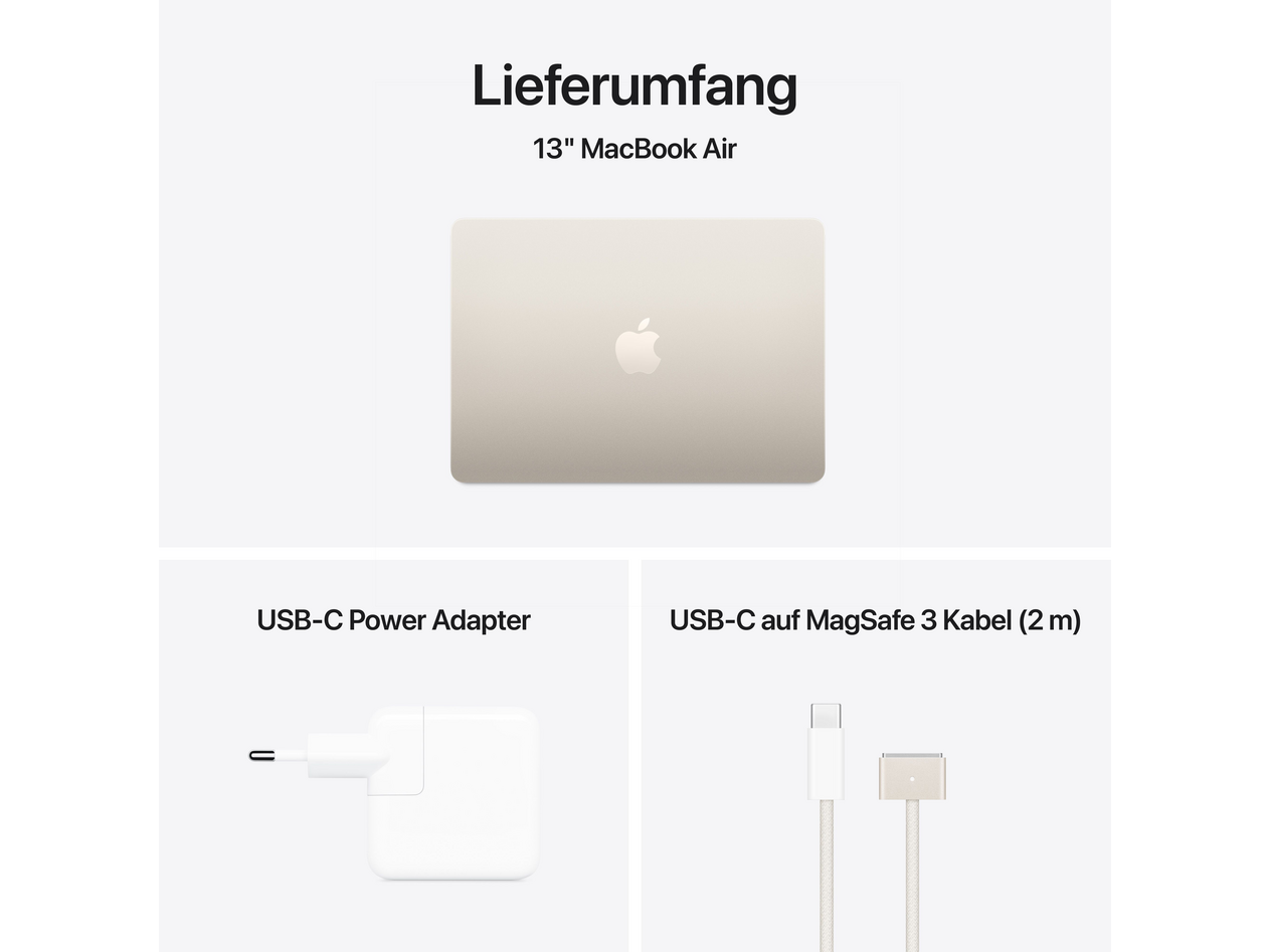 Im Lieferumfang: 13,6 Zoll MacBook Air, 30W USB-C Port Power Adapter, USB-C auf MagSafe 3 Kabel (2 m)