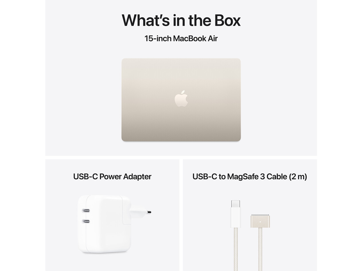Im Lieferumfang: 15 Zoll MacBook Air, 35W USB-C Port Power Adapter, USB-C auf MagSafe 3 Kabel (2 m)