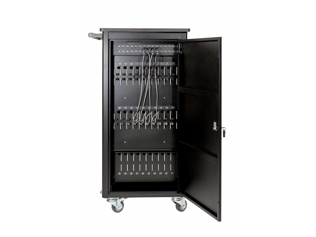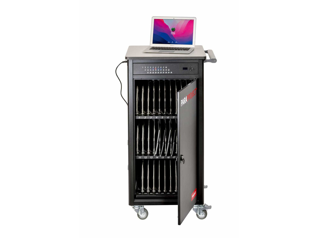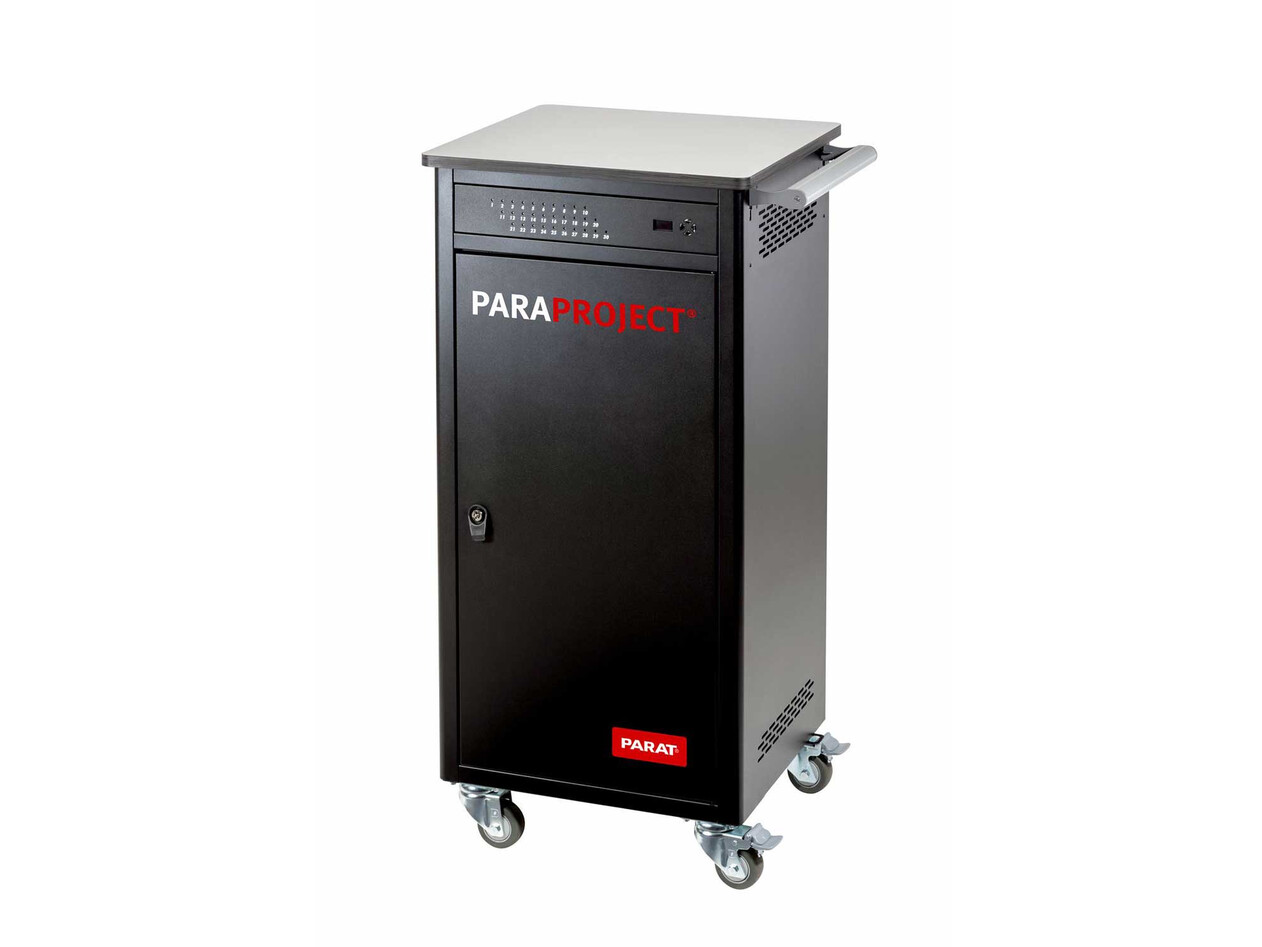 Viele Geräte und wenig Platz? Hier glänzt der effiziente PARAPROJECT® Trolley C30 mit seinen 30 nummerierten Fächern für Tablets, Chromebooks oder Notebooks. Verteilt auf drei Ebenen, lassen sich die Geräte in dem schlanken Korpus sicher aufbewahren und transportieren. Ausgestattet mit 30 USB-C®-Ladekabeln, kann der Trolley sofort eingesetzt werden. Bis zu 60 W pro Port ermöglichen schnelles Laden und unterstützen USB-PD Power Delivery. Durch die intelligente LED Statusanzeige hat man stets im Blick, ob die Geräte noch laden oder bereits voll sind. Zudem ist jederzeit eine Ampere/Watt-Abfrage möglich. Planungssicherheit bringt die integrierte Wochenzeitschaltuhr, die effiziente Ladepläne ermöglicht. Jedes der dreißig Fächer ist klar nummeriert und bietet verschiedene Kabelführungen und -halterungen, um Ordnung zu halten. Kabelsalat ade! Außerdem bietet der PARAPROJECT® Trolley C30 eine aktive Lüftung. Eine Transportsicherung und die abschließbare Tür bieten zusätzlichen Schutz. Der robuste Trolley aus Stahl ist ebenso mit feststellbaren, gummierten Leichtlaufrädern ausgestattet sowie mit einem Griff aus perforiertem Aluminium. Die obere Ablagefläche kann als Pult genutzt werden. Seitlich am Trolley finden sich Stromanschluss und ein Hauptschalter. Zwei zusätzliche Schuko-Steckdosen ermöglichen das Verwenden von Peripheriegeräten, wie z.B. Masterlaptop oder Beamer.