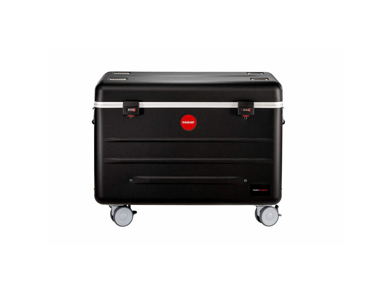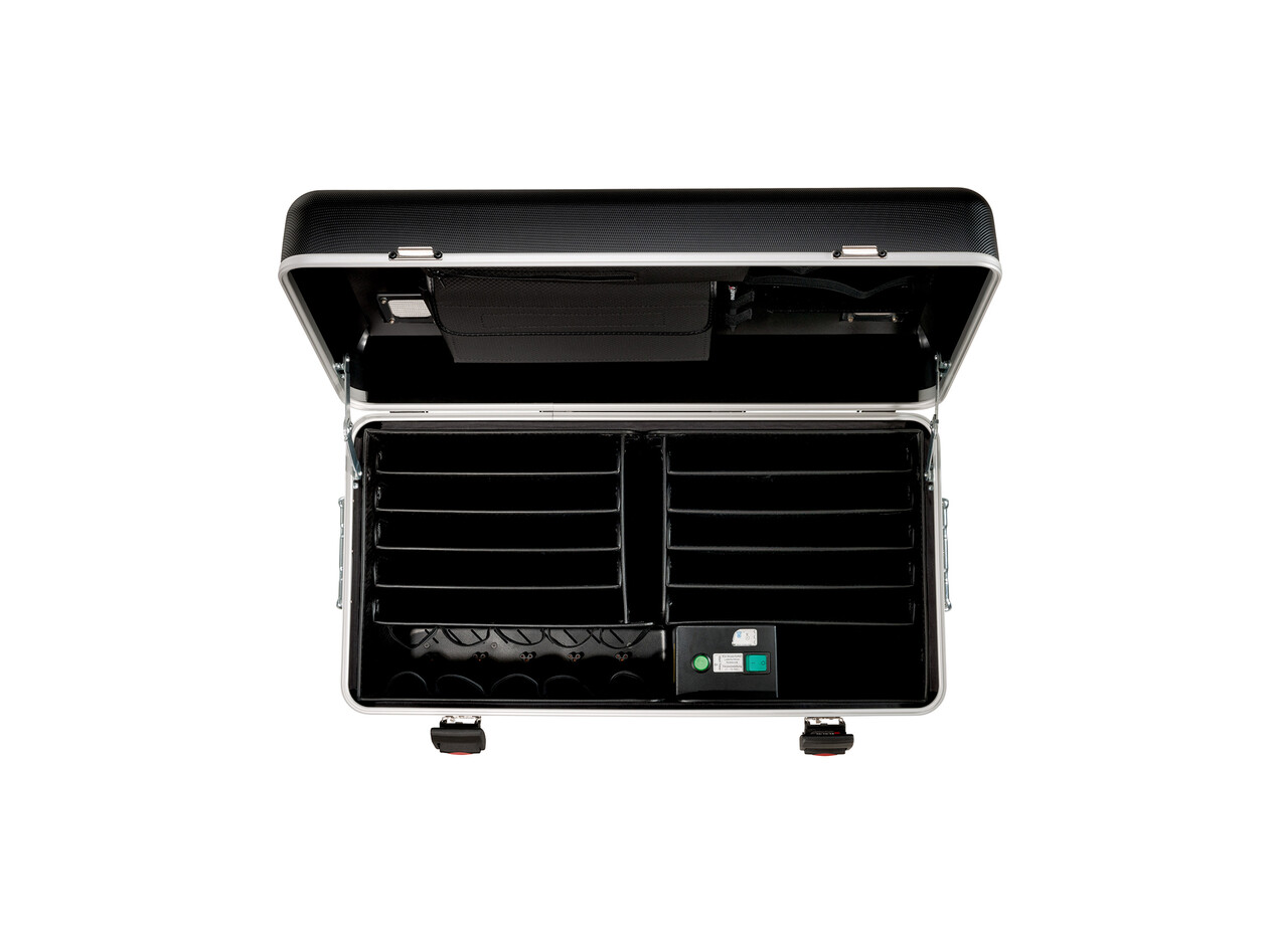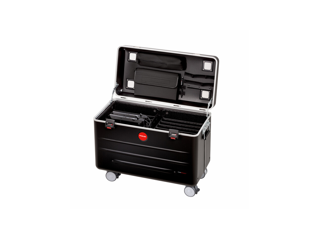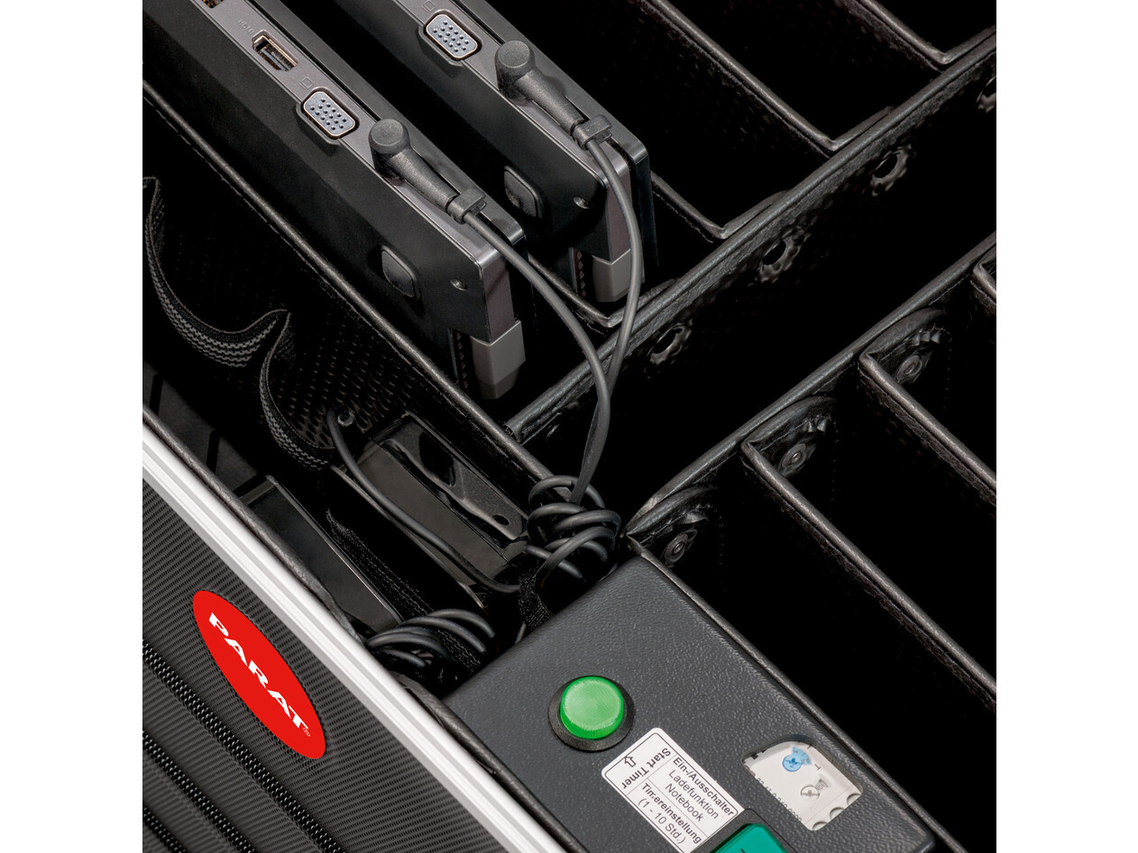 Das PARAPROJECT® Case N10 ist die ideale Transport- und Ladestation für zehn Note-, Ultra- oder Chromebooks bis 15,6. Der mit einem Zahlenschloss geschützte Systemkoffer verfügt über ausreichend Stauraum für die Originalnetzteile und bietet über den internen Timer die Möglichkeit, Ladezeiten individuell einzustellen. Neben der separaten Steckdose für einen Access Point verfügt das Case zudem über Öffnungen im Deckel und Bodenbereich, um eine optimale Luftzirkulation sicherzustellen. Die schlagzähe Außenschale aus gummiertem X-ABS-Kunststoff sowie der umlaufende Aluminiumrahmen am Deckel und Korpus sorgen für eine extrem hohe Stabilität. Innen mit 3-poligen IBM-Buchsen (C5) ausgestattet, werden alle Geräte über nur einen zentralen Stromanschluss verbunden. Transportieren lässt sich das PARAPROJECT® Case N10 bequem , per 4-fach Teleskopauszug als Trolley oder über zwei Tragegriffe. Im Lieferumfang enthalten sind zudem fünf Y-Adapter mit zwei Euro-8-Buchsen (2-polig).