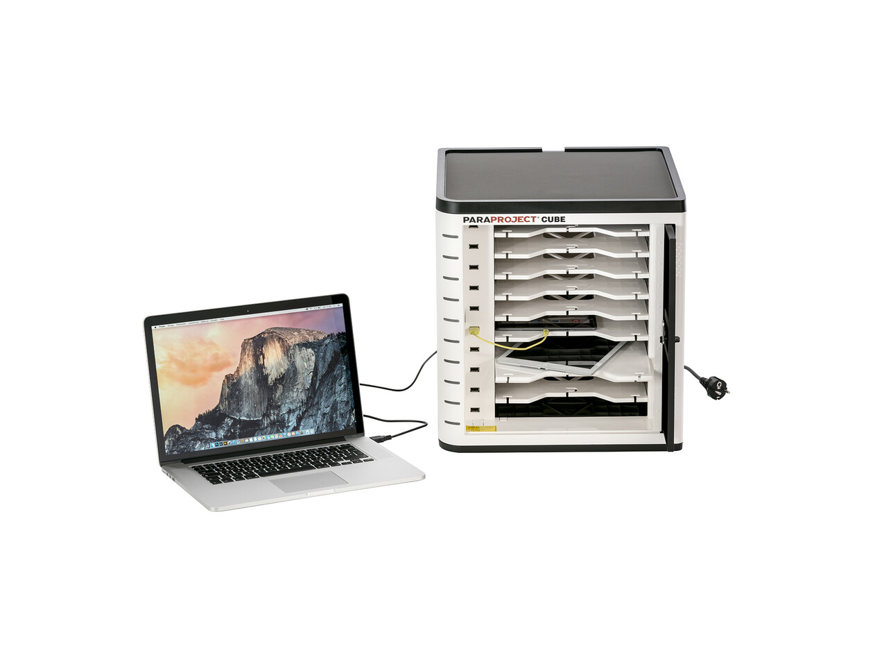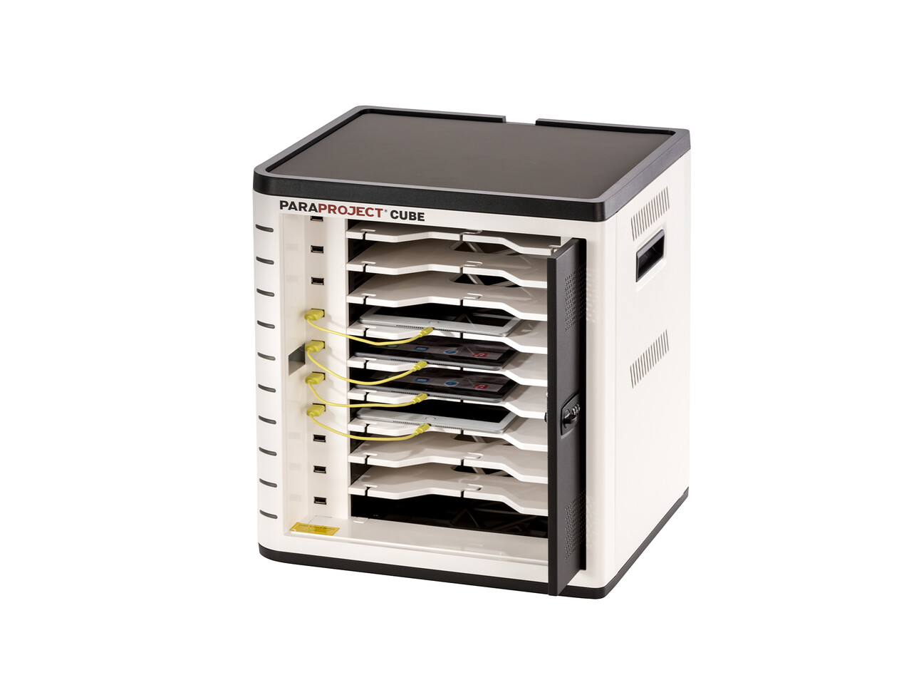 Mit dem PARAPROJECT® Cube U10 sind bis zu zehn iPads oder andere Tablets (bis 11,6") sicher untergebracht. Neben dem zuverlässigen Aufladen ermöglicht der Cube U10 plattformunabhängiges Synchronisieren für identische Softwareausstattung und aktualisierte Daten. Besonderen Schutz bietet diese Aufbewahrungslösung durch ein Zahlenschloss sowie eine integrierte Diebstahlsicherung. Per optionaler Wandhalterung lässt sich der Cube U10 problemlos am gewünschten Ort fest montieren.